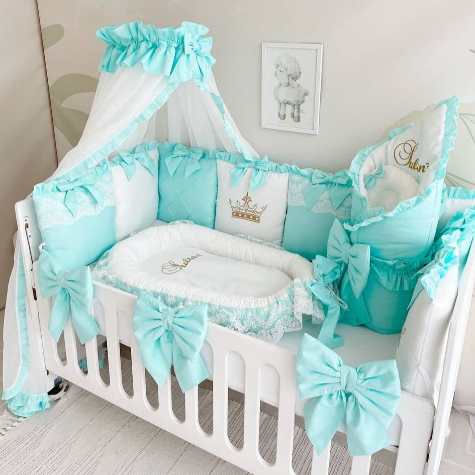 Baby nest design with lace along the edges and cotton sateen or soft plush inside + personal embroidery.