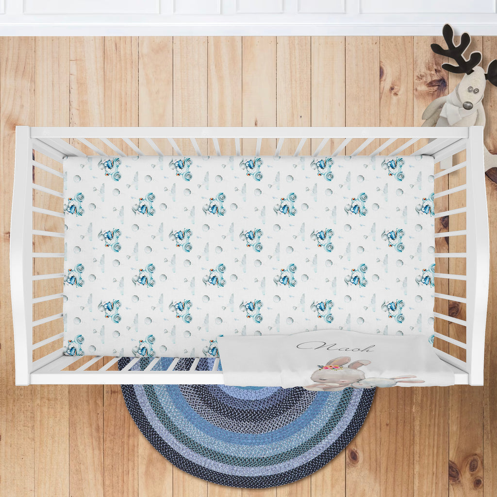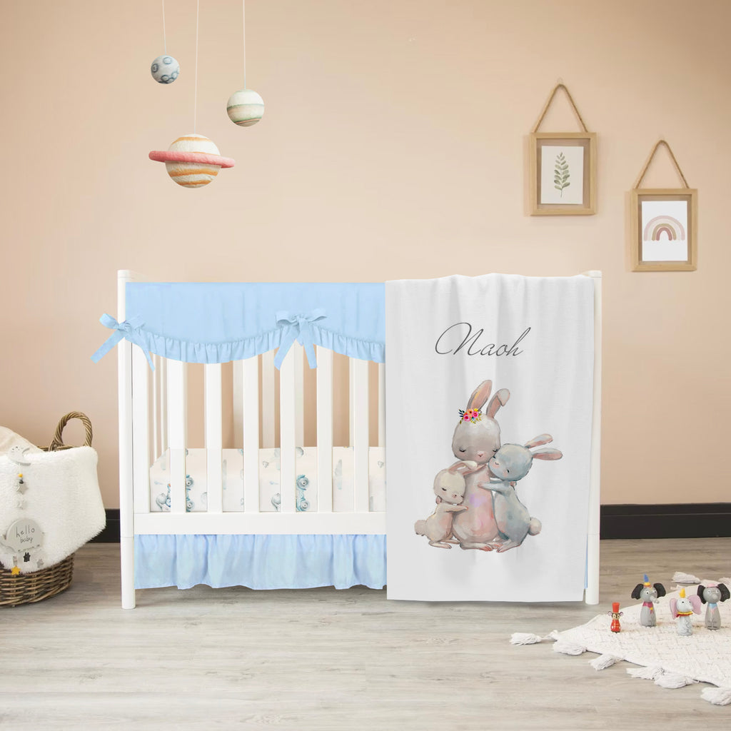 This baby designer nursery bedding will become a great baby shower gift for the baby. Blue Bunny baby bedding fits little prince nursery and offers different options.