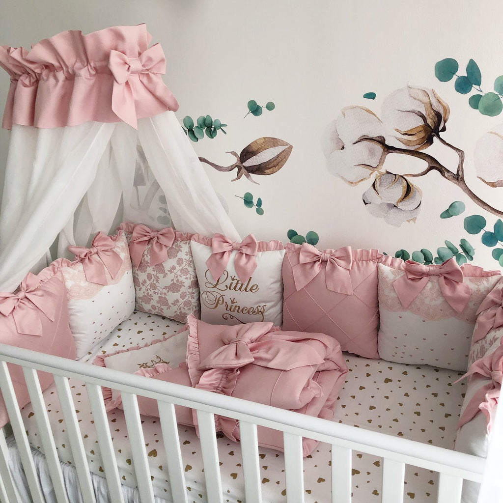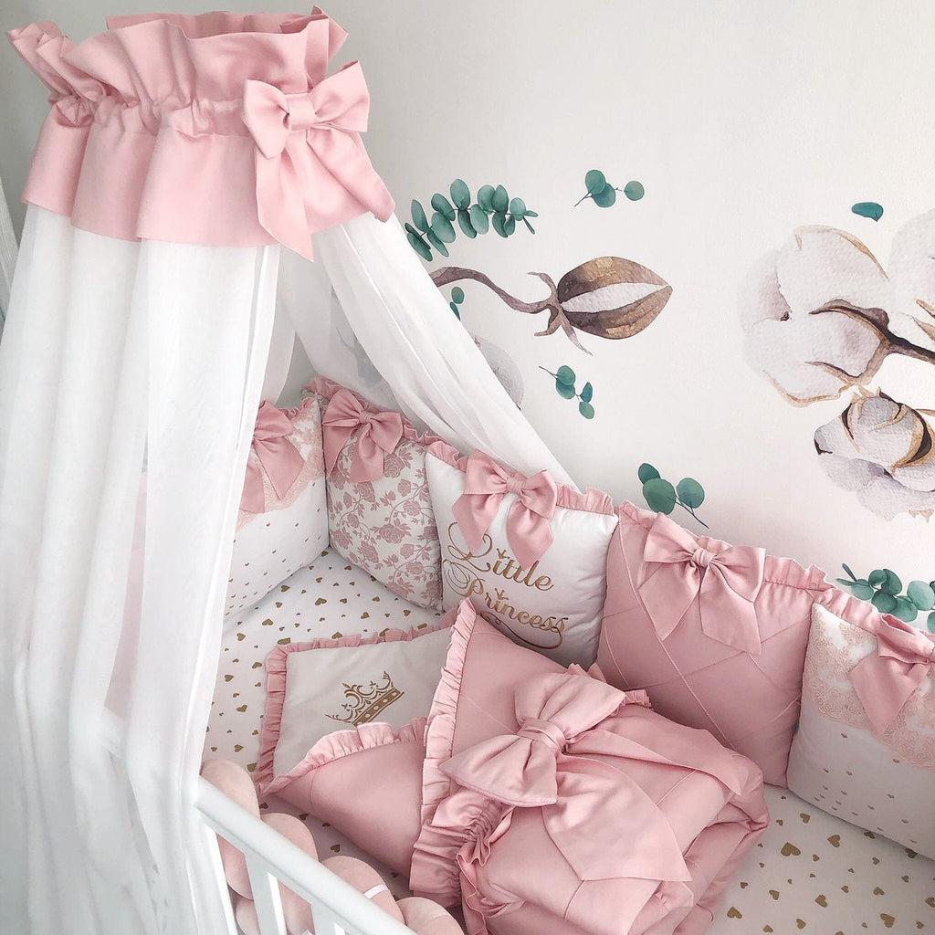 Luxury pink crib bedding set with custom embroidery will be a unique gift for baby shower or newborn gift for girls. To produce this crib bedding set only premium top quality fabrics applied. Add customized embroidery with baby name on the crib bumpers, blanket and baby nest. You can select this baby bedding in different options.