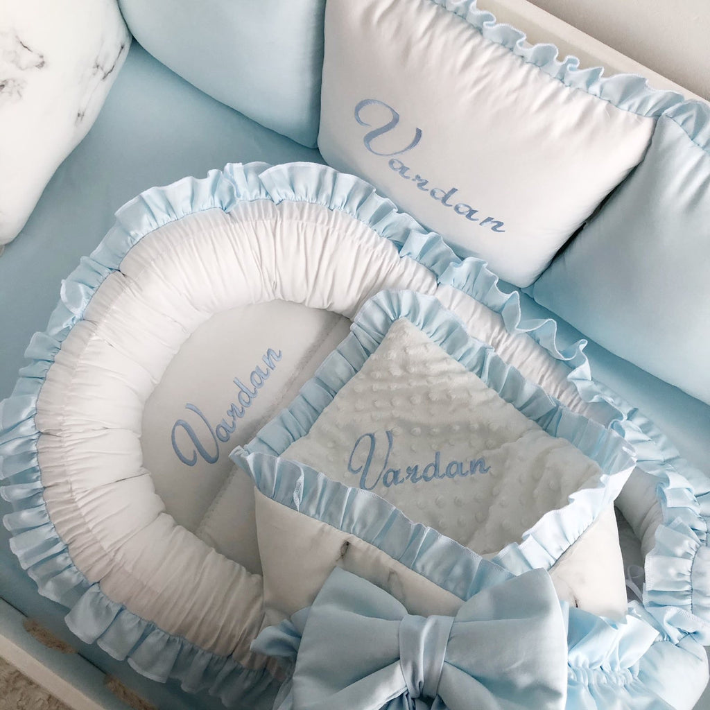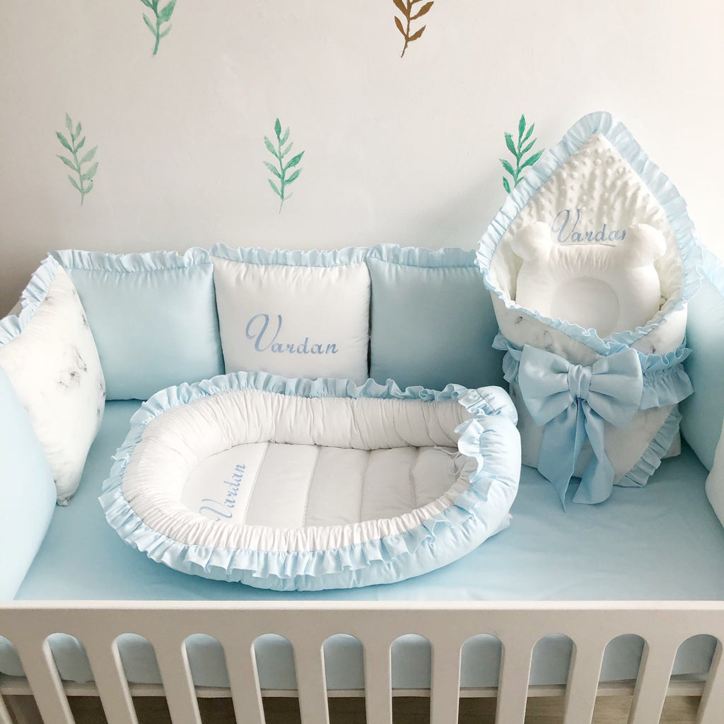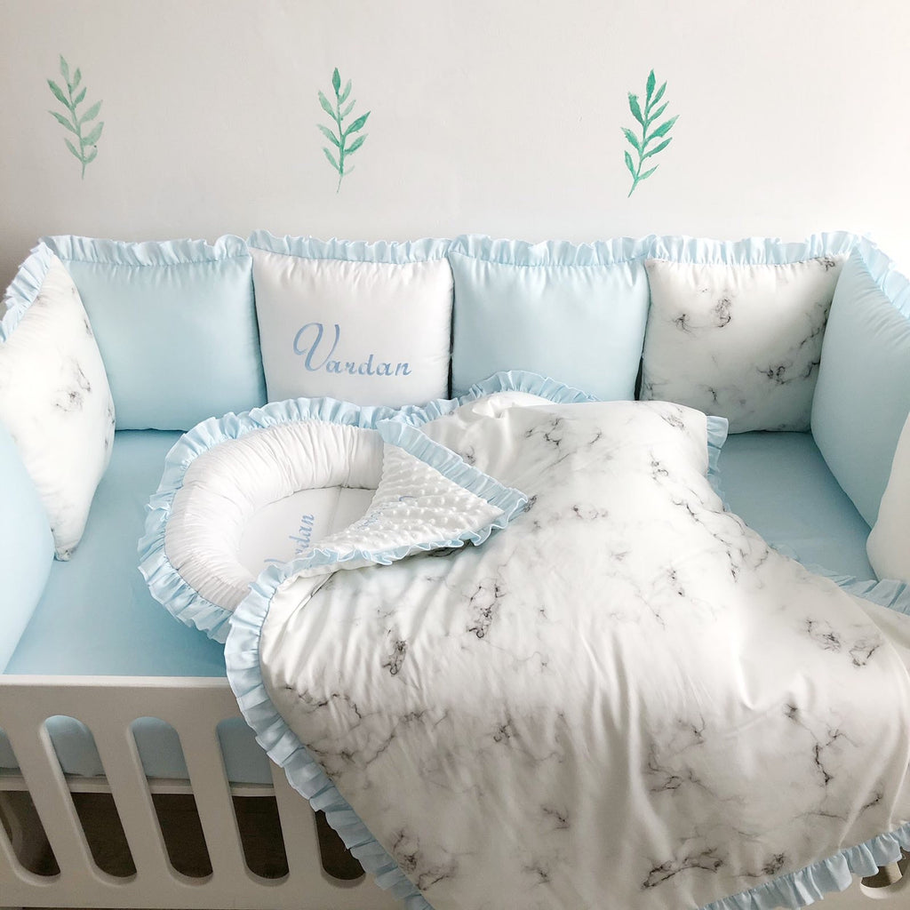 - SET OF 8 pillows for three sides of the crib (size can be customized).