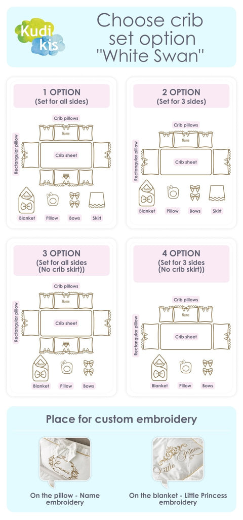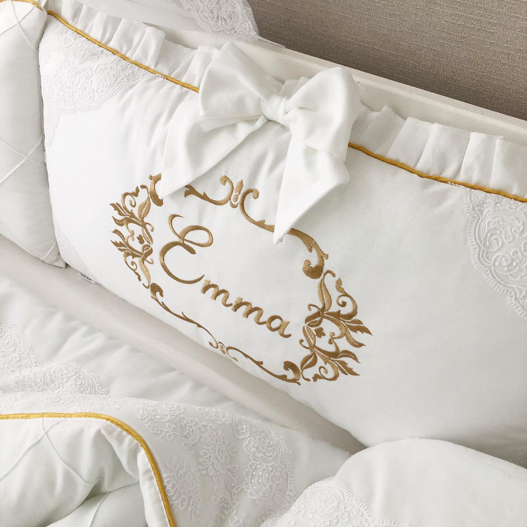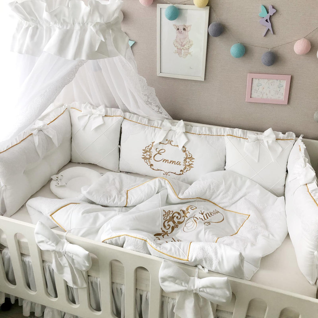 - SET OF bumper pillows to cover all sides of the crib (size can be customized) + personal embroidery