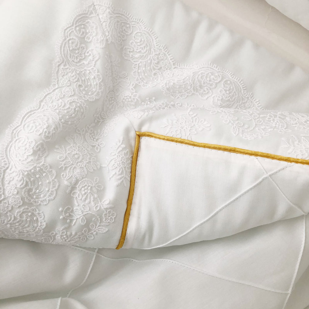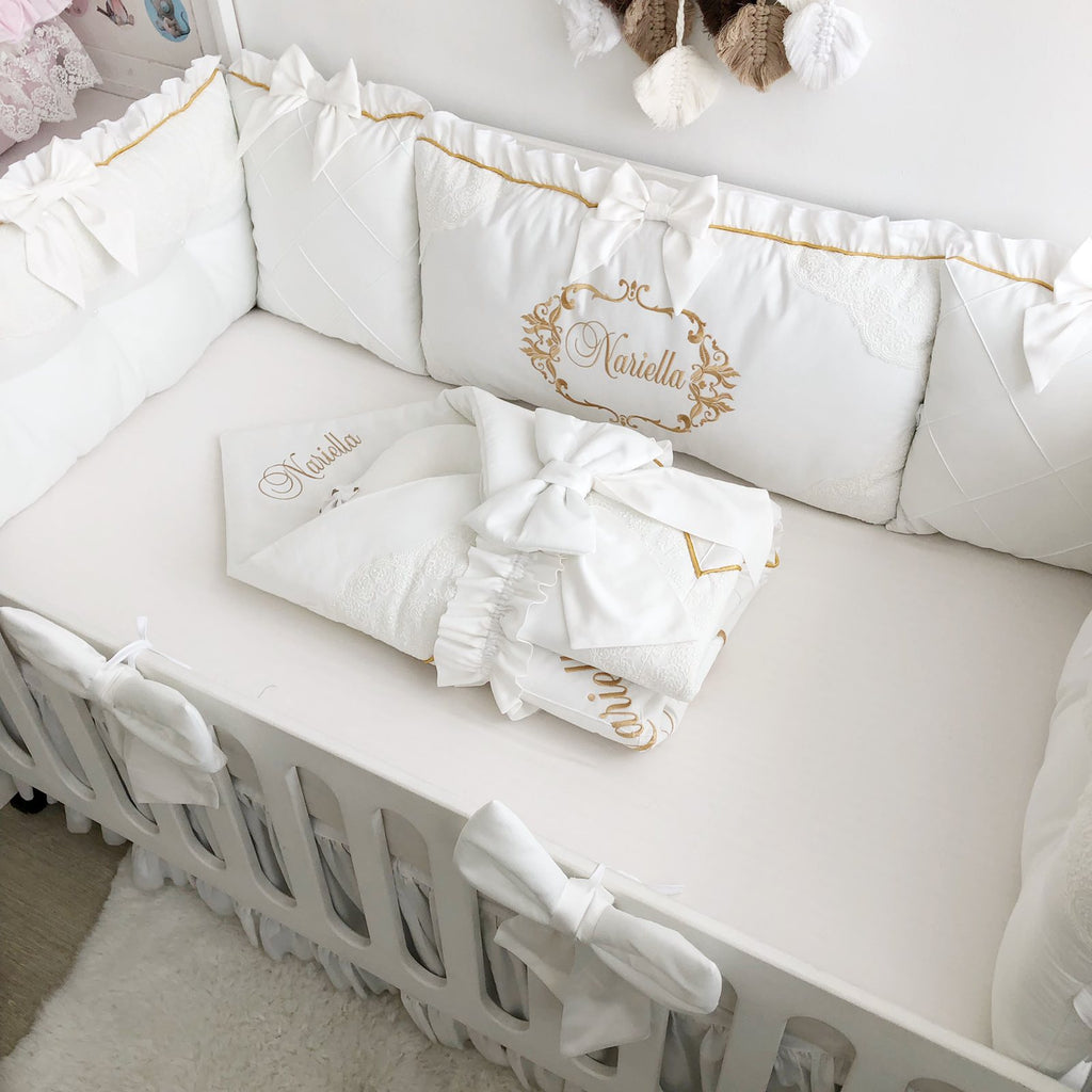 White baby blanket with golden embroidery and bow will be a unique and personalized gift for baby.