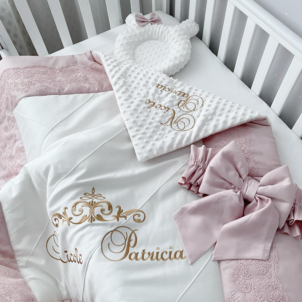 - Baby blanket with plush inside + baby pillow + bow + personal embroidery. Size: 100x110 cm (39x43")
