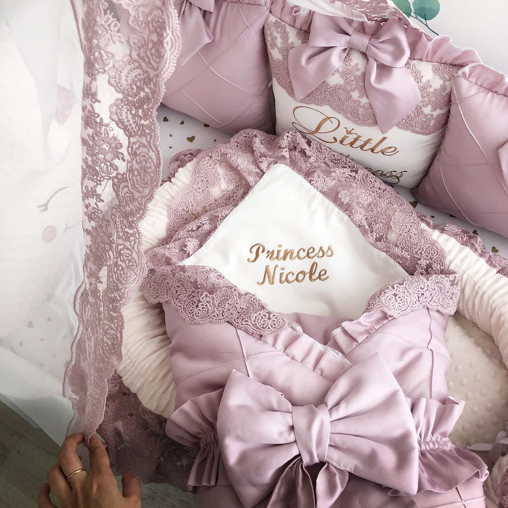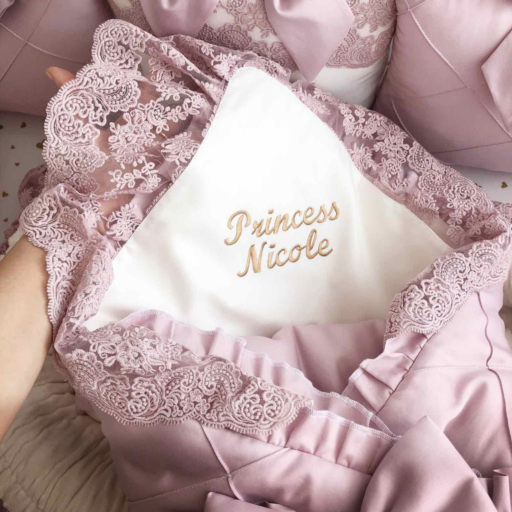 - Baby blanket + bow 43x39 in + lace liner for the blanket (with personal embroidery)