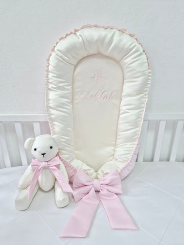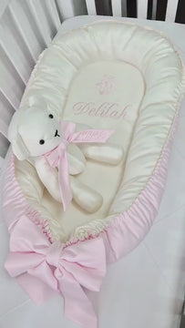 Baby Nest with bow (Age: 0-7 months) + Name embroidery + soft teddy bear