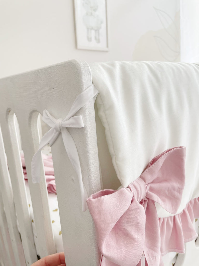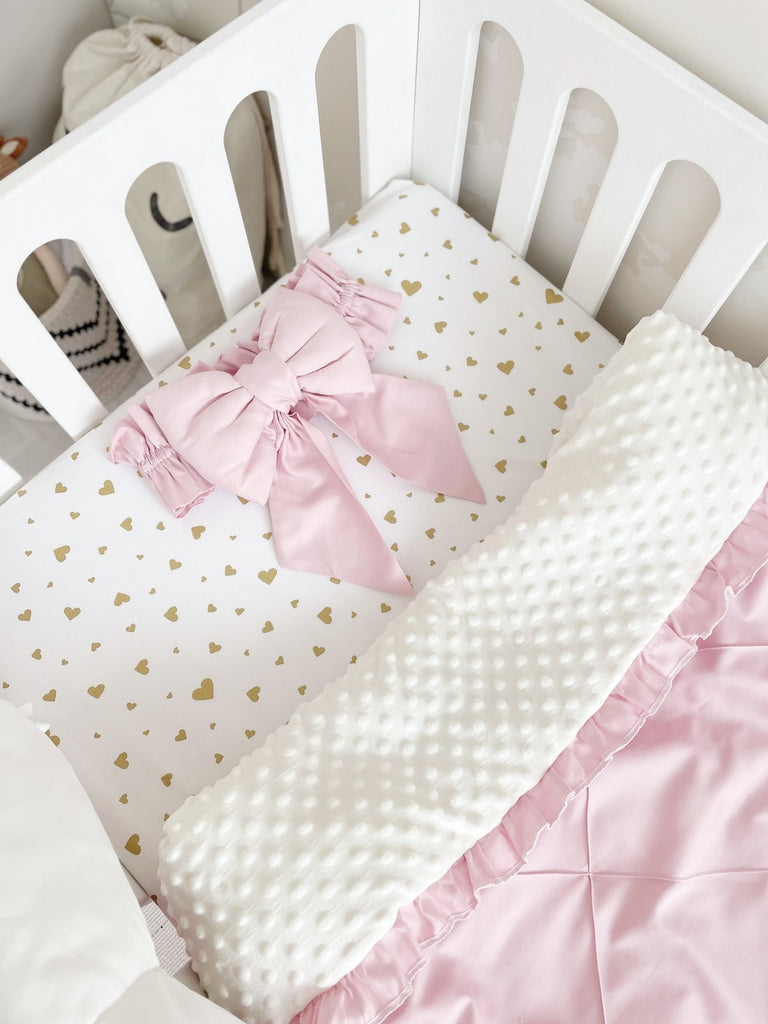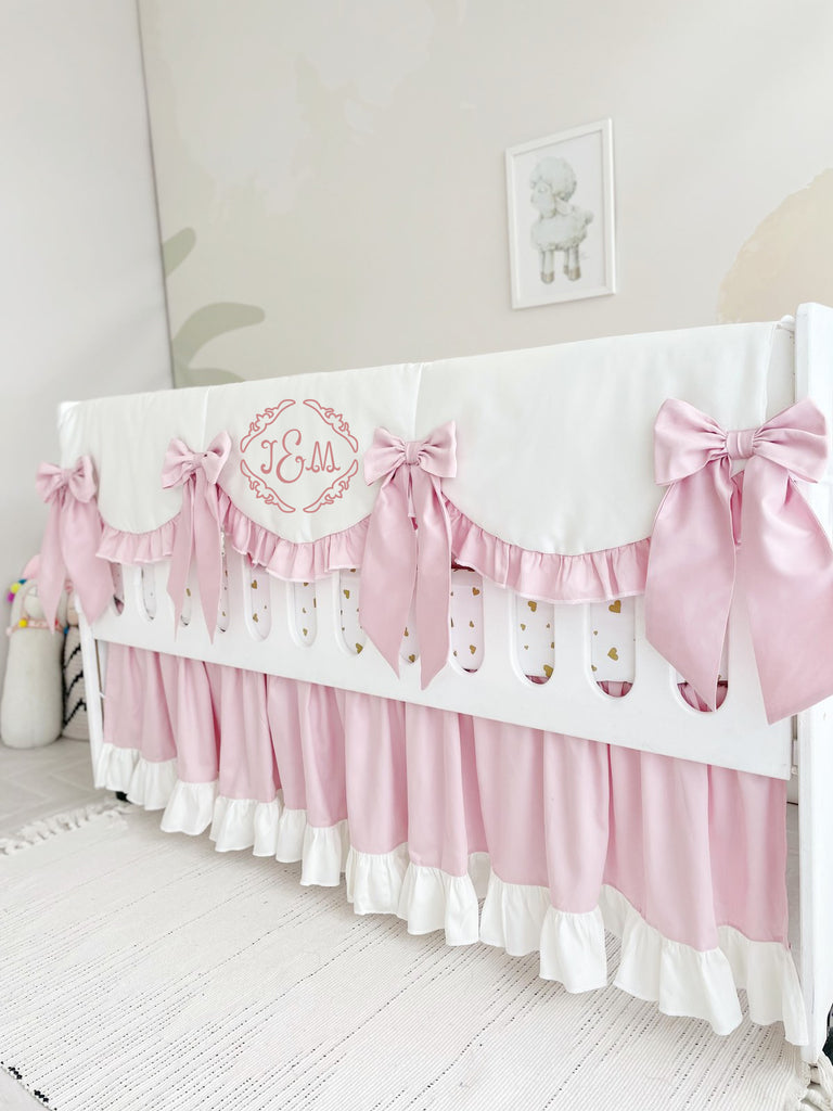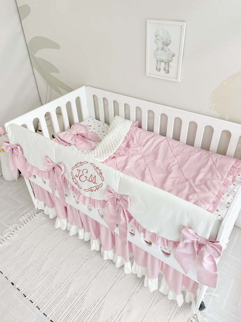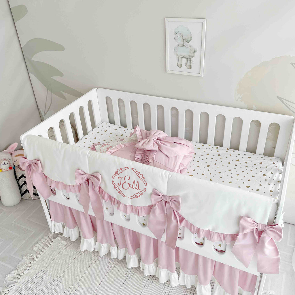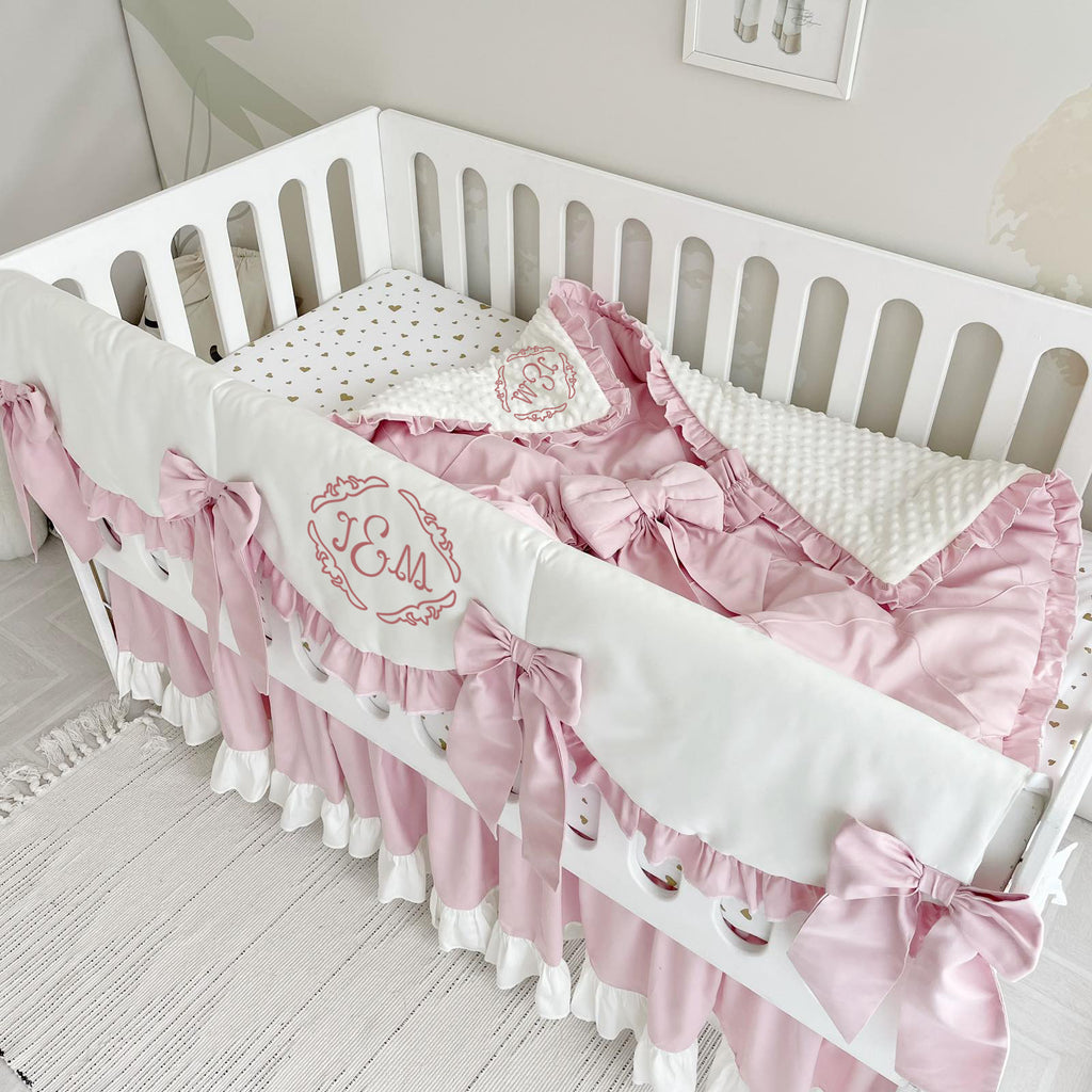 Introducing our Crib Set "Elegant Dream" – a luxurious and enchanting baby bedding ensemble in a sophisticated blend of rosy pink and off-white, adorned with custom embroidery.