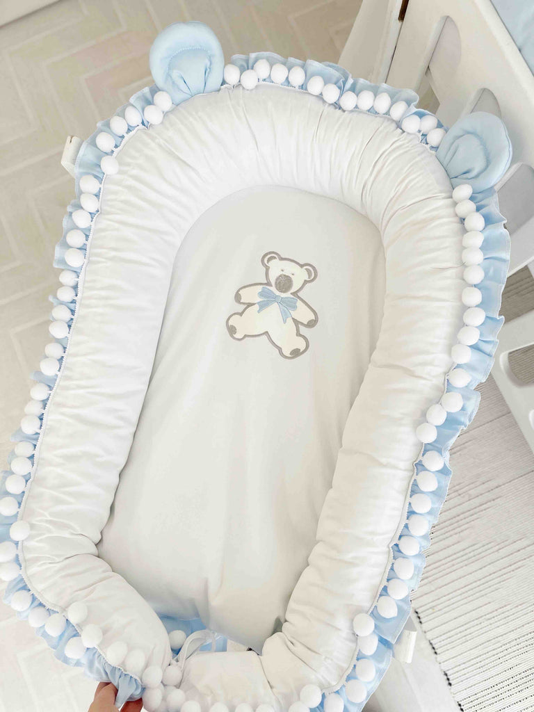 - Baby cocoon with ruffles, ears, and pompons (Age: 0-7 months) + Bear embroidery