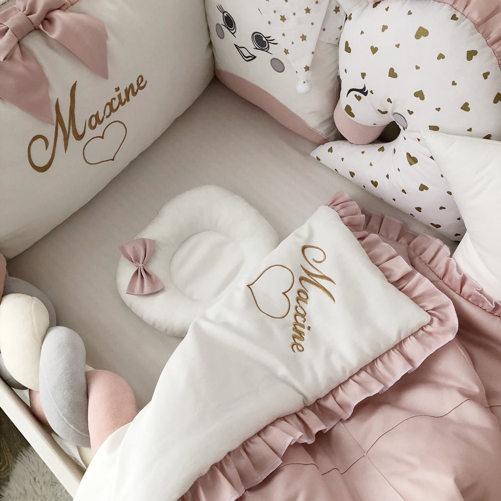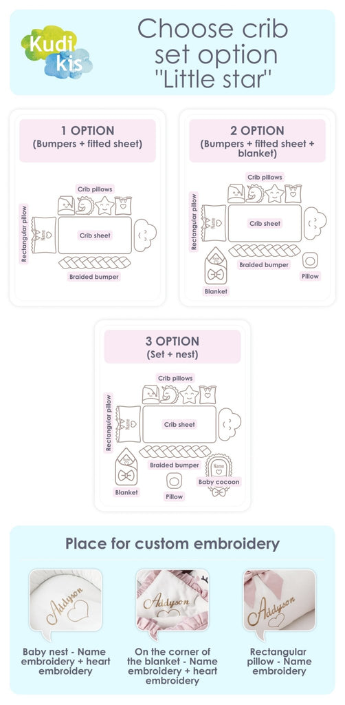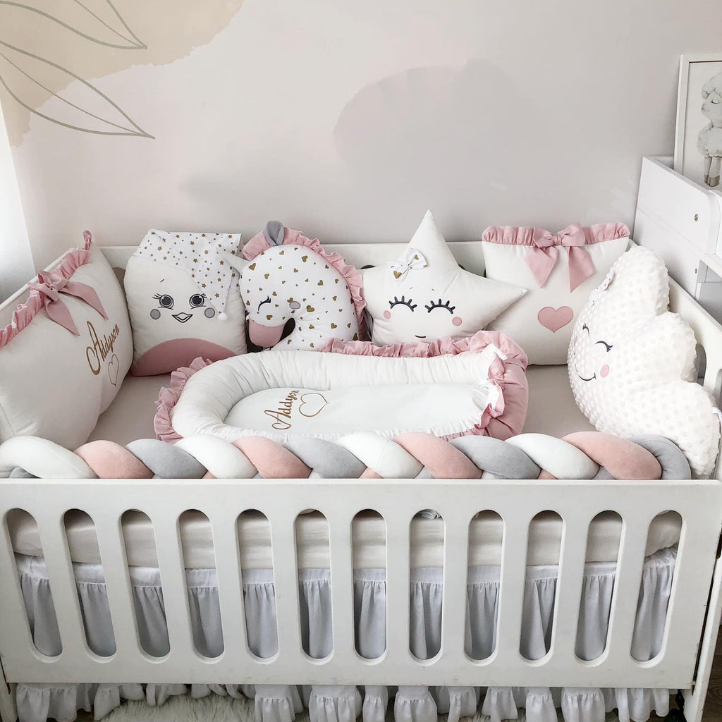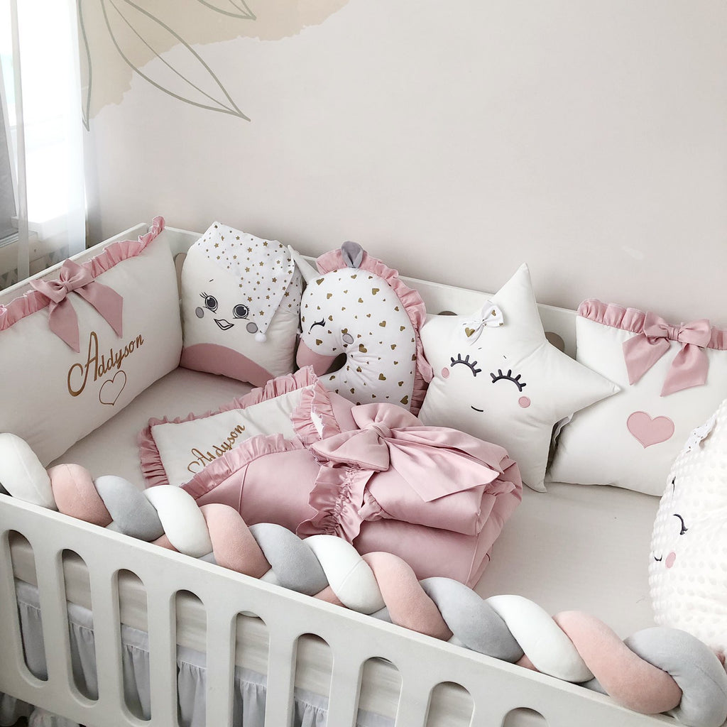 - Crib pillows: 3 character pillows, 1 square pillow, 1 cloud pillow, 1 rectangular pillow with Name embroidery