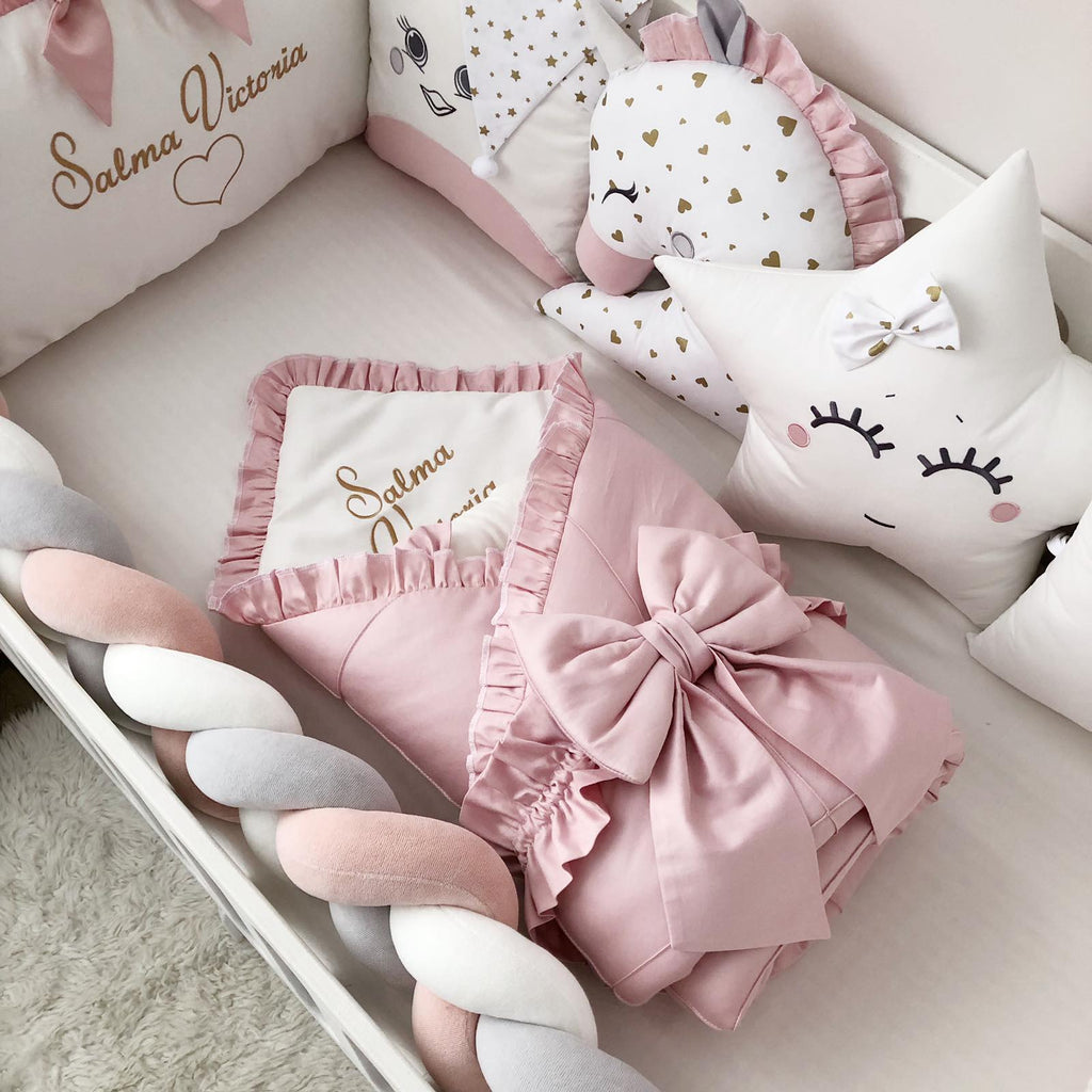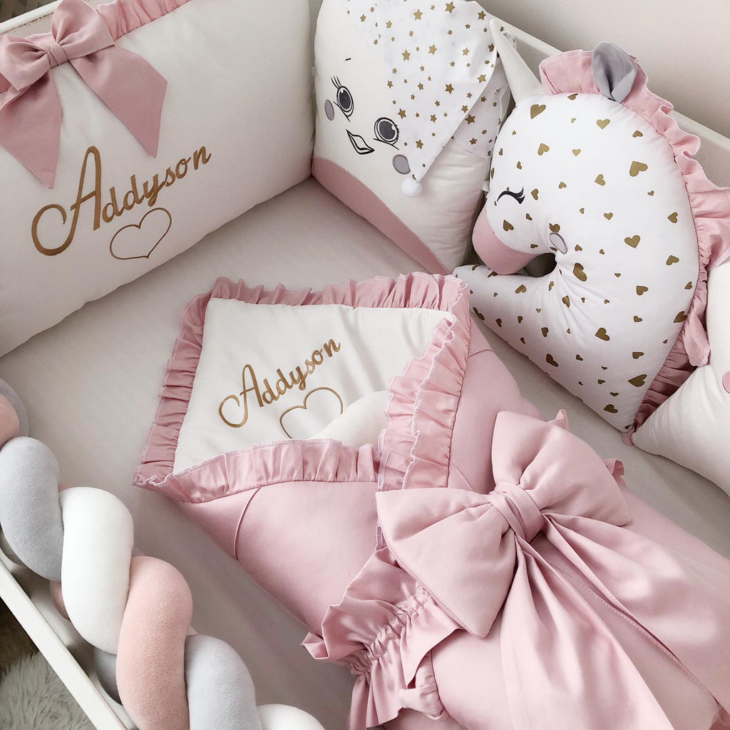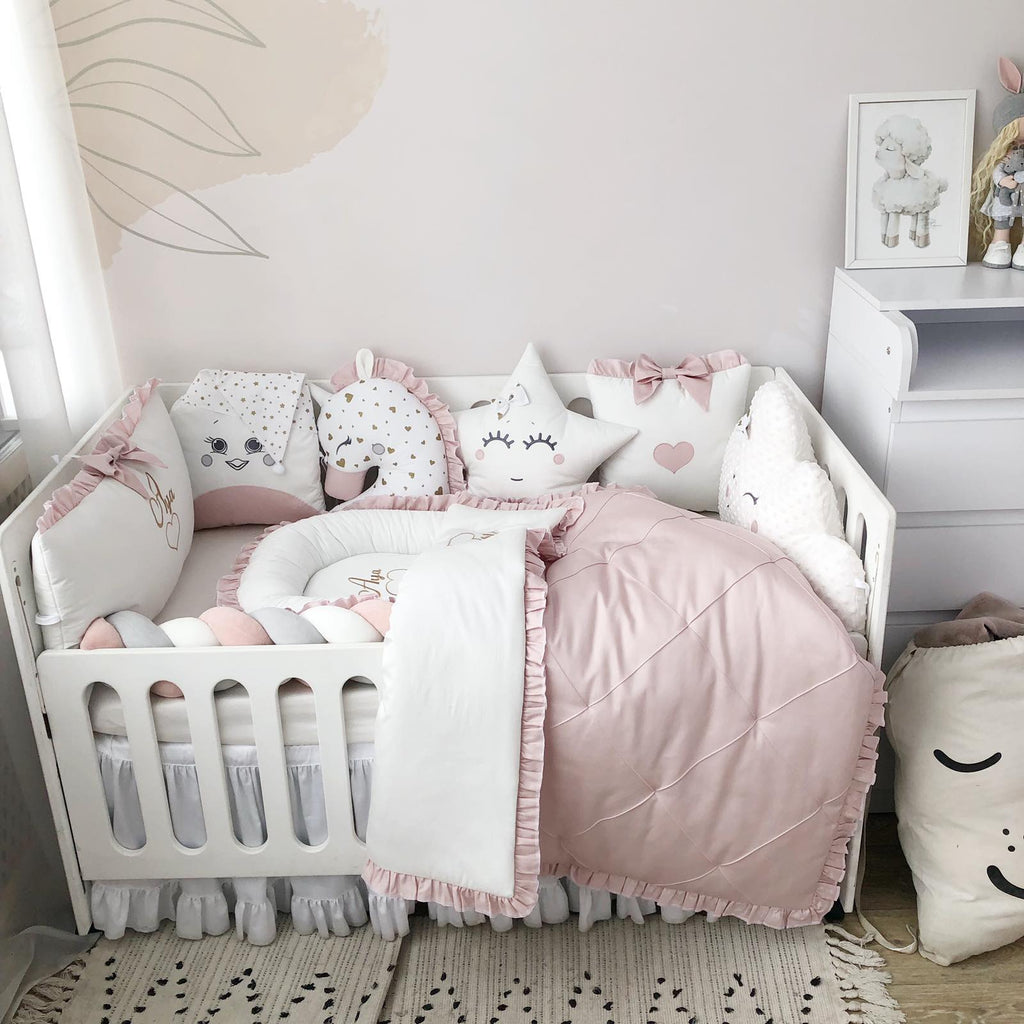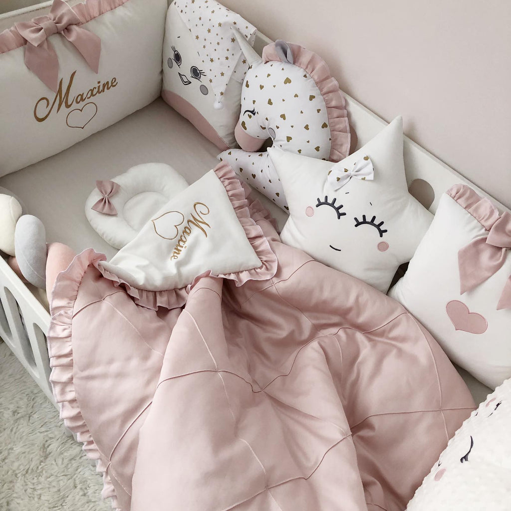 - Crib pillows: 3 character pillows, 1 square pillow, 1 cloud pillow, 1 rectangular pillow with Name embroidery