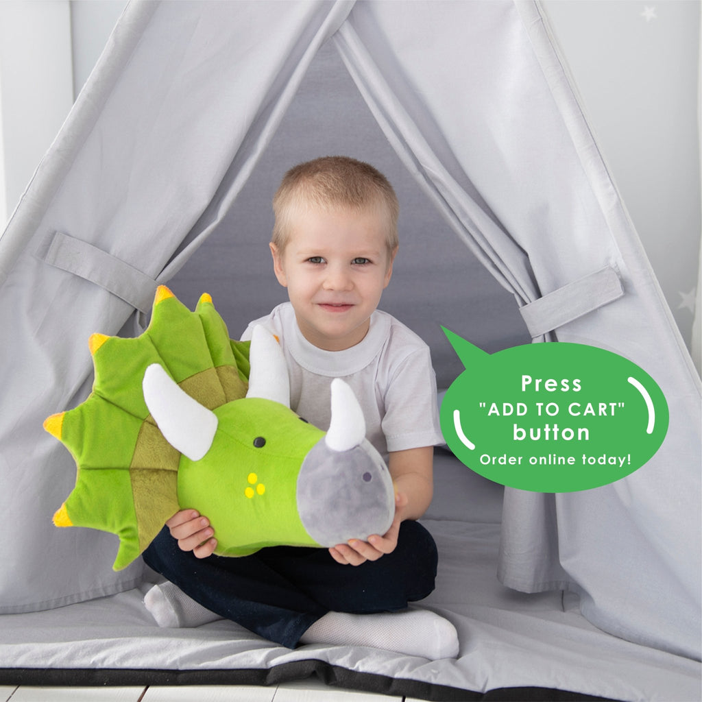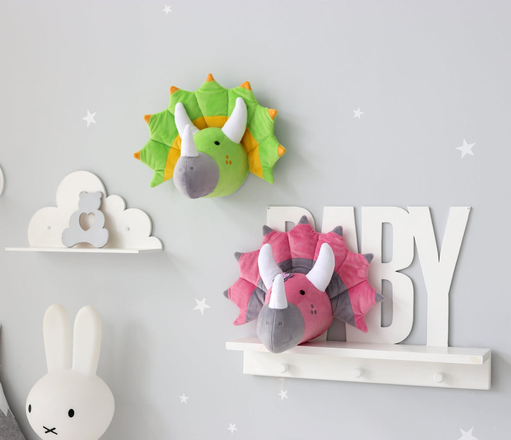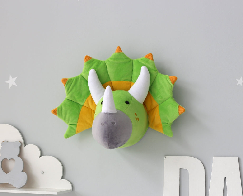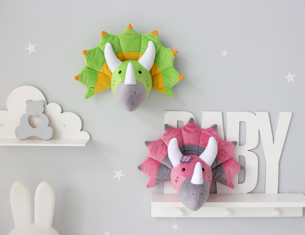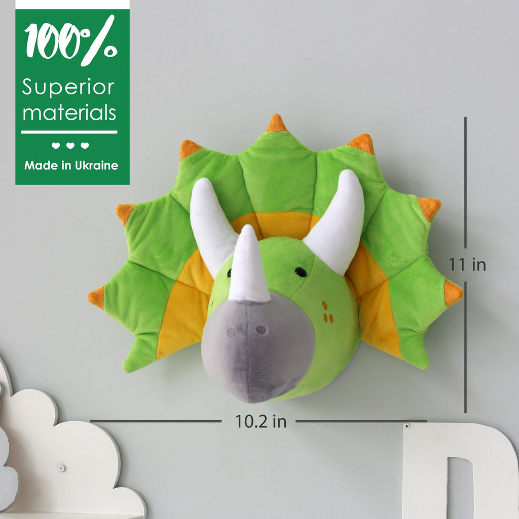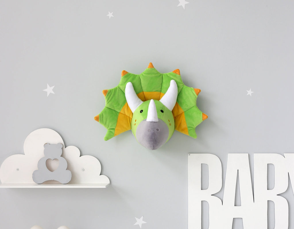 Dinosaur Head Wall Mount Decor made from soft plush fabric. This dinosaur head wall mount definitely deserves a place in your kids room or nursery decor. T-rex wall decor fits perfectly into the Dino lovers interior as a unique accent on the room wall.