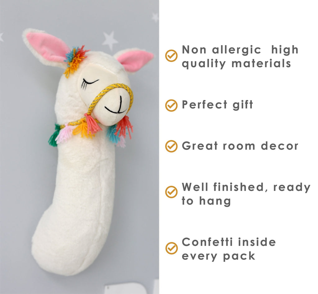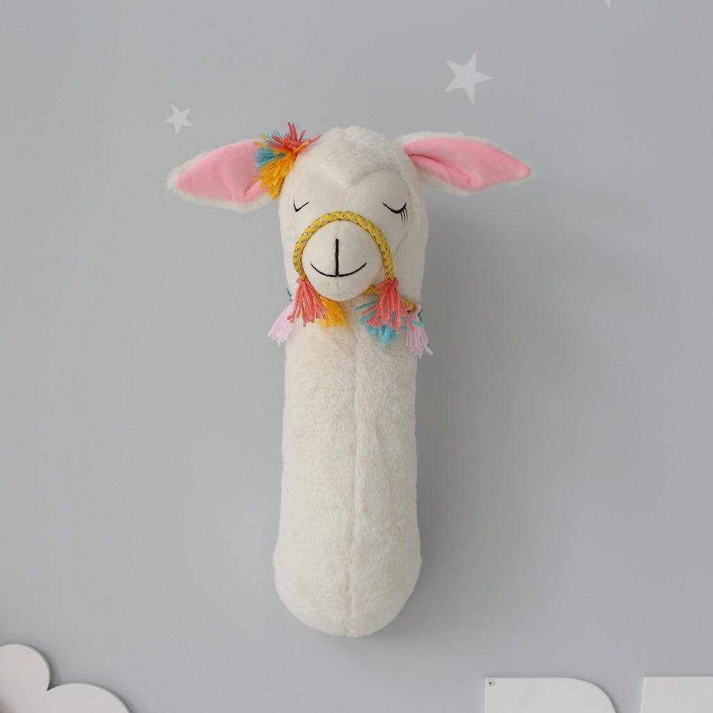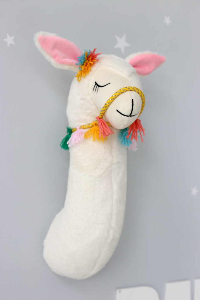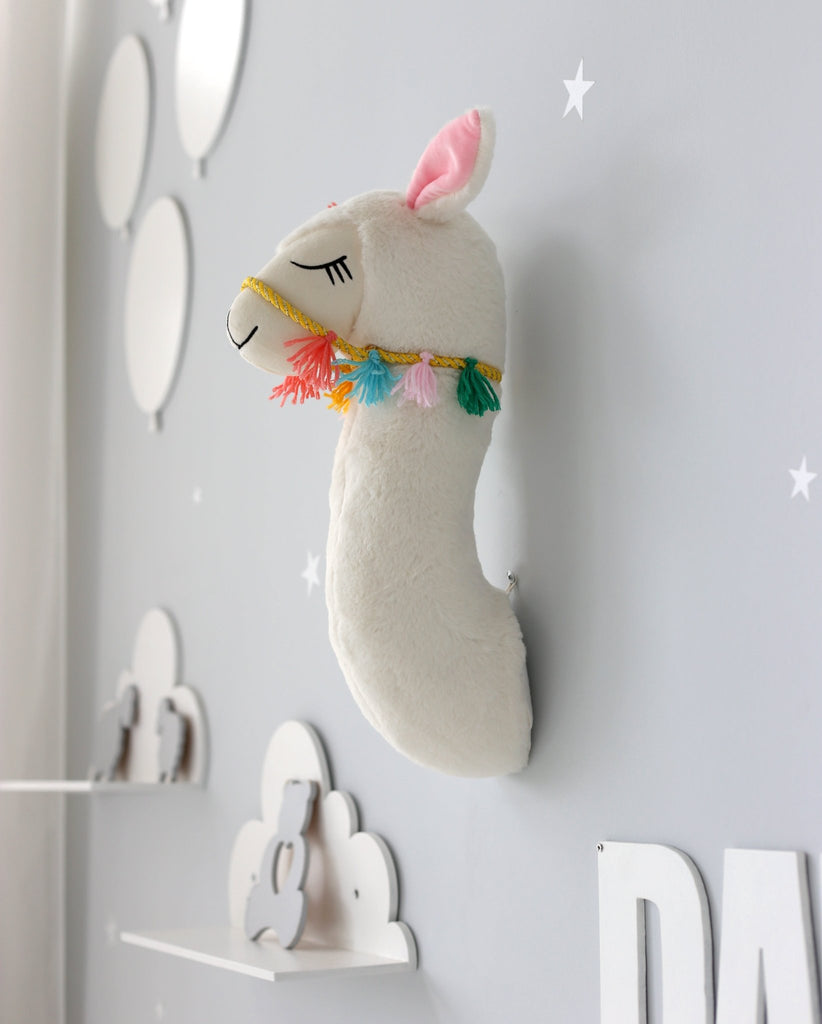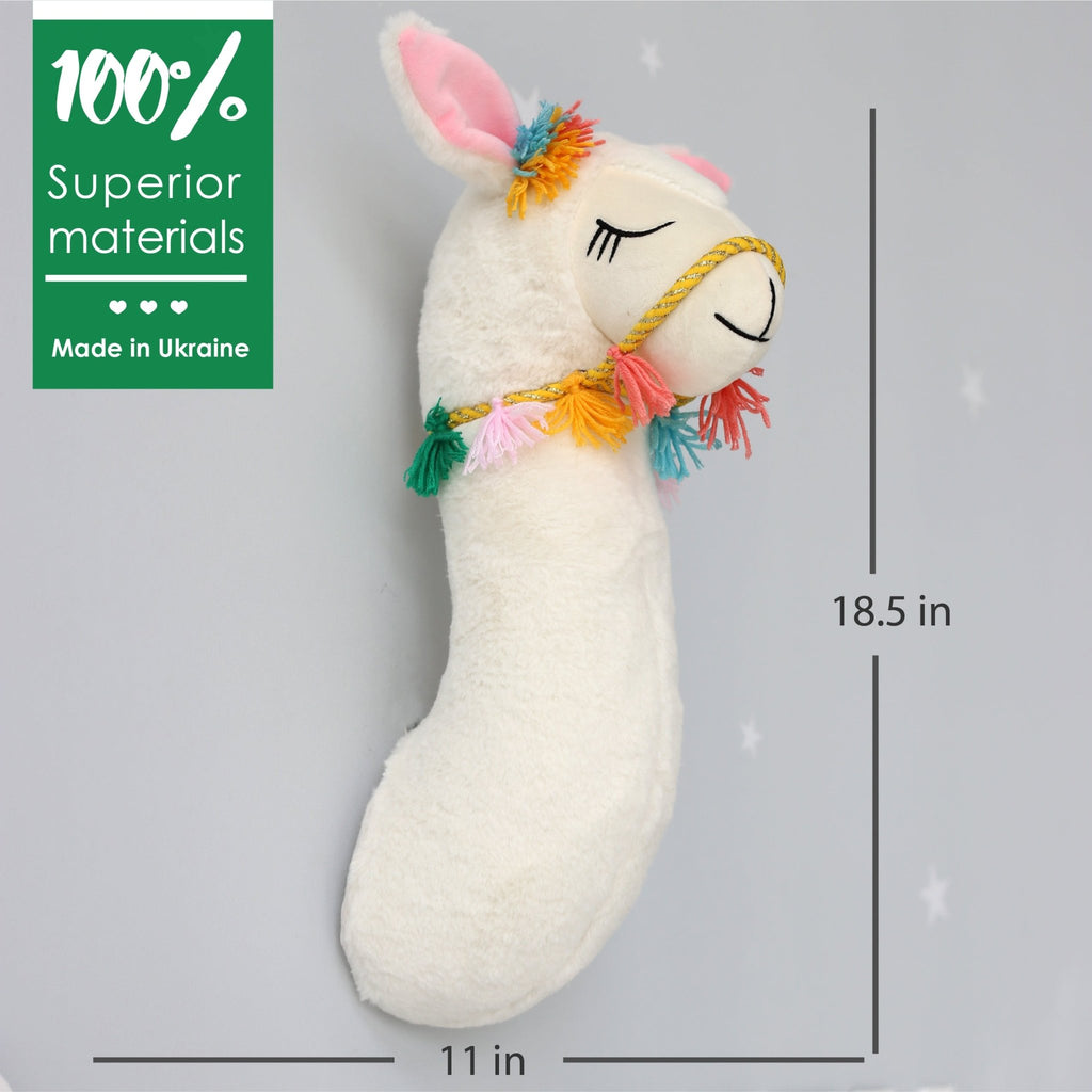 Llama Head Wall Mount Decor made from soft plush fabric. This Llama head wall mount definitely deserves a place in your girl's room or nursery decor. Llama wall decor fits perfectly into the Llama lovers' interior as a unique accent on the room wall.