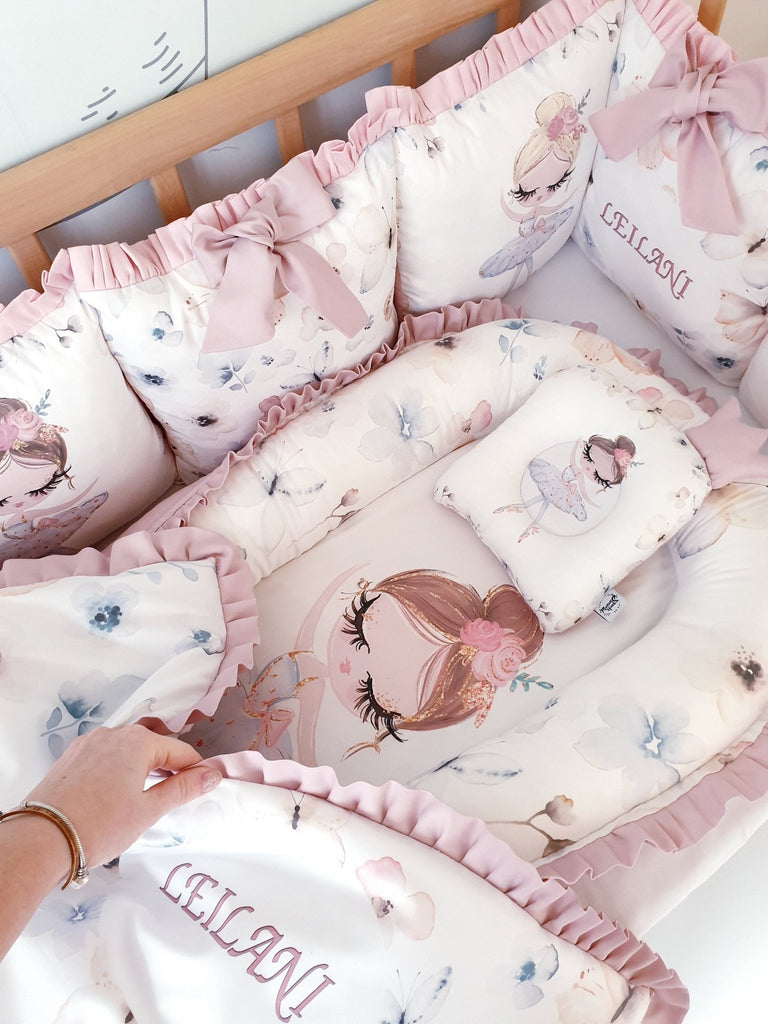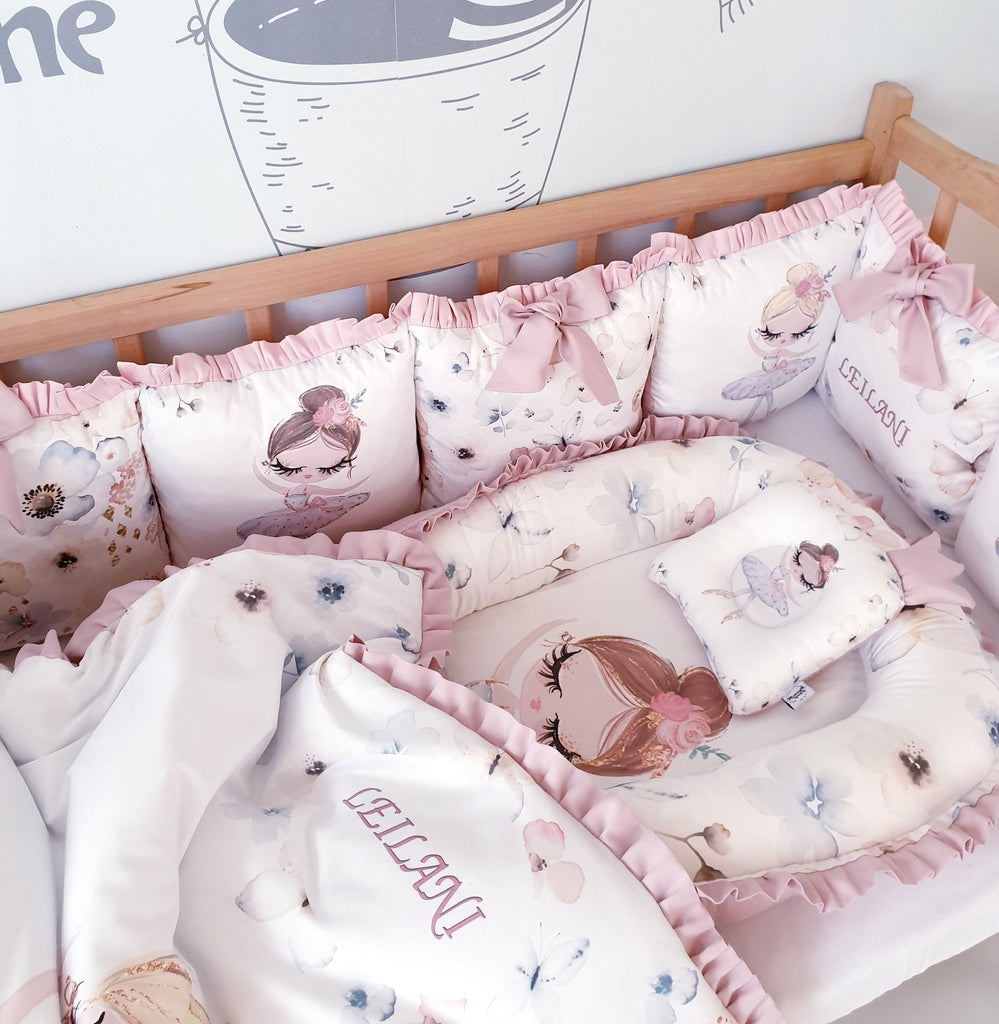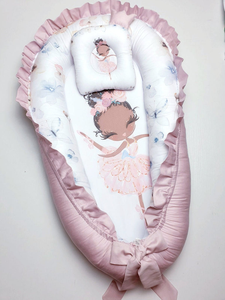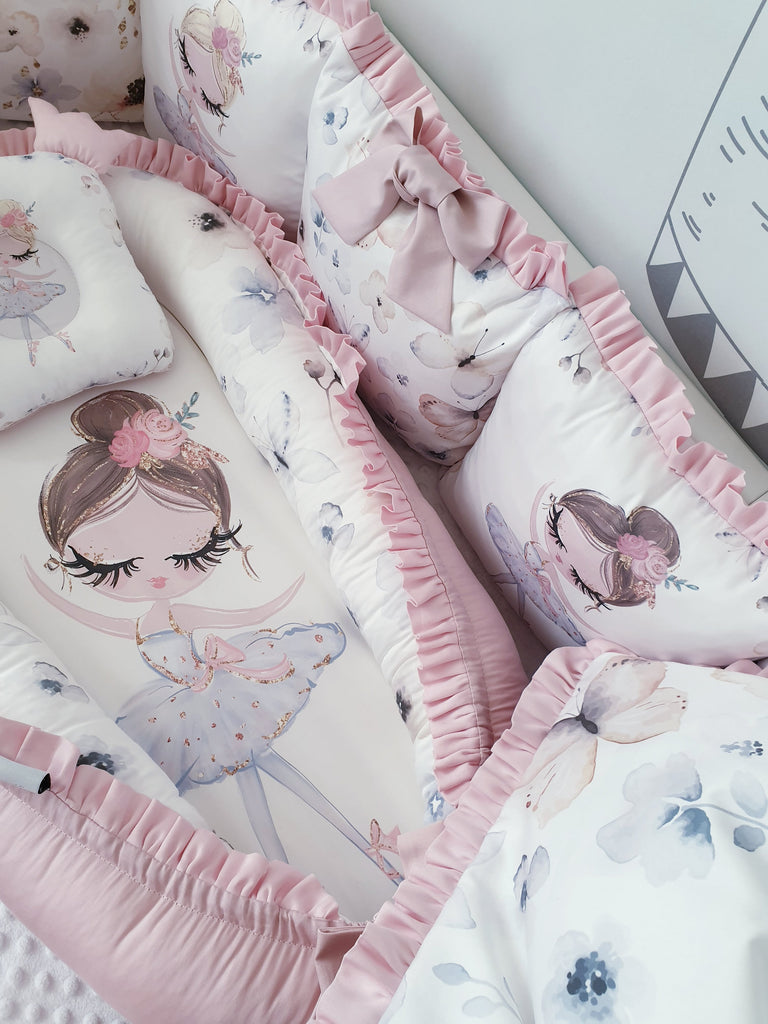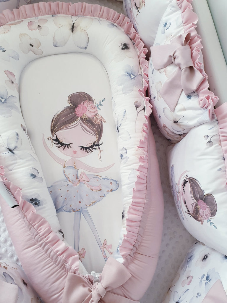 Baby nest with changing mattress and ballerina print. Age: 0-7 month. Dimensions: 55 x 95 cm (21,65 x 37,4 in) Sleeping area 30x65 cm (11.8 x 25 in)